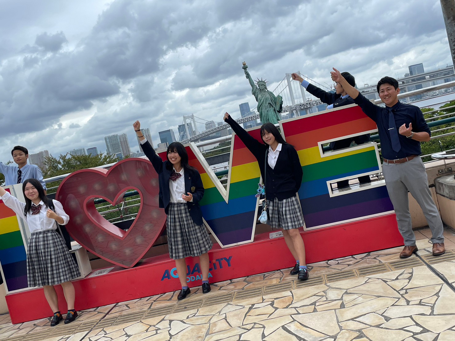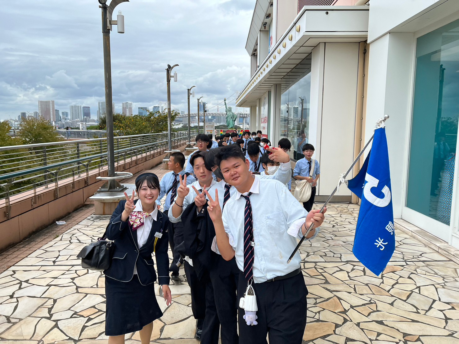 2023年9月30日 【修学旅行速報⑧】お台場海浜公園散策 お台場へ到着しました! 普段はテレビで見ることが多いレインボーブリッジや自由の女神像、フジテレビなどを背景に記念撮影。 このあと、バスは一路浅草へ向かいます。